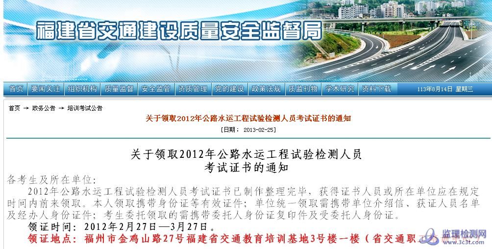 如果楼主很想知道自己的证什么时候能领的话,建议可以看一下所在地省级交通质监机构的官网。看一下2012年的证是什么时候领取的,就能大概知道今年什么时候领了。比如福建2012年的证是今年2月25日发证[attach]36907[/attach]