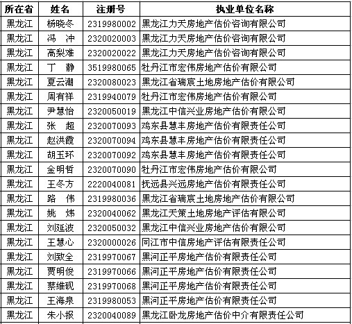 黑龙江房产估价师5月23日获准延续注册的人员名单