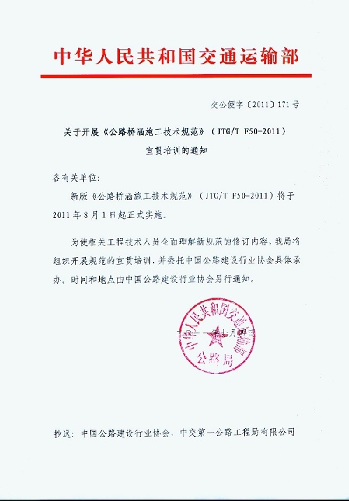 公路桥涵施工规范2011版本JTG/T F50-2011 所属行业:公路工程 软件大小:5.88MB 发布时间:2011-07-18 软件来源: 评分等级:0 软件简介:交通运输部已经公布《公路桥涵施工技术规范》(JTG/T F50-2011),作为公路工程行业推荐性标准,自2011年8月1日起施行,原《公路桥涵施工技术规范》(JTJ 041-2000)同时废止。本规范详细介绍常见及最新桥梁施工方法,技术,工艺及质量要求,内容包括:桥梁施工常用资料,桥梁施工组织设计,桥梁施工测量,桥梁施工支架、模板及