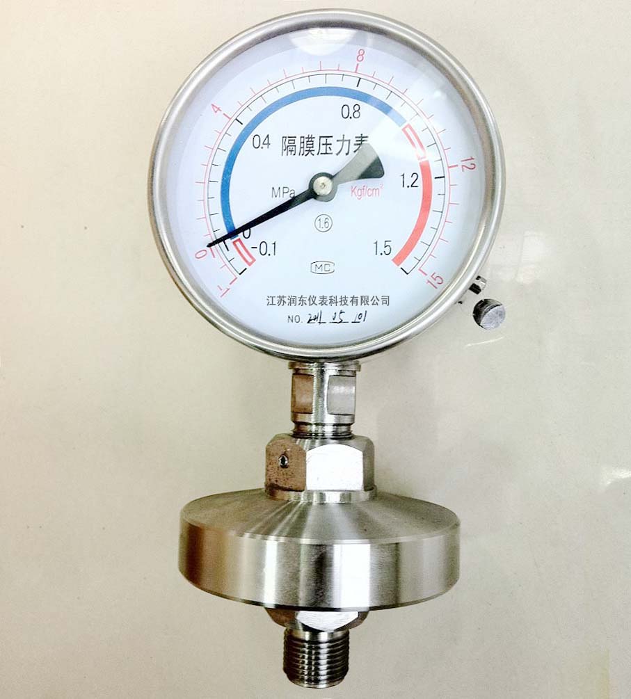 YMF-100B、YMF-150B不锈钢隔膜压力表是由膜片隔离装置和配用压力表两大部分组成。隔膜压力表广泛应用于石油、化工、医药、食品、造纸等行业测量具有强腐蚀性、高粘度、易结晶及含有固体颗粒的液体介质压力。隔膜压力表结构原理不锈钢隔膜压力表由各种通用型压力仪表和不同结构的隔膜隔离器组成一个封闭系统,内充密封液。当...