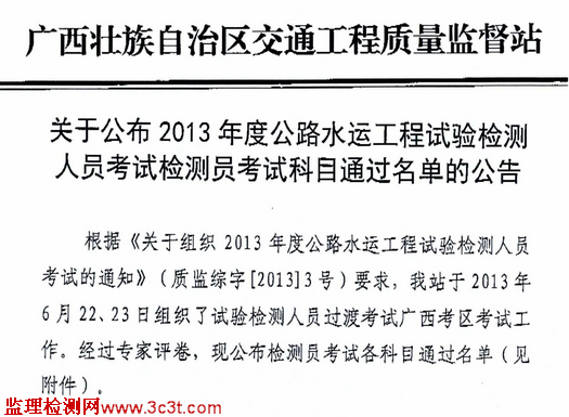 关于公布广西2013年度公路水运工程试验检测人员考试检测员考试科目通过名单的公告
