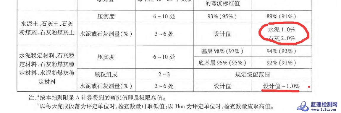 如附件,新规范65页 上边的水泥剂量极限值为 1% 石灰 2% -----可低于设计值的 1% 或 2% 下边的水泥石灰稳定料剂量极限值为 -1% -----难道这个是可低于设计值的 -1% ?