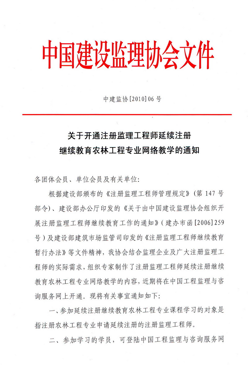 关于开通注册监理工程师延续注册继续教育农林工程专业网络教学的通知