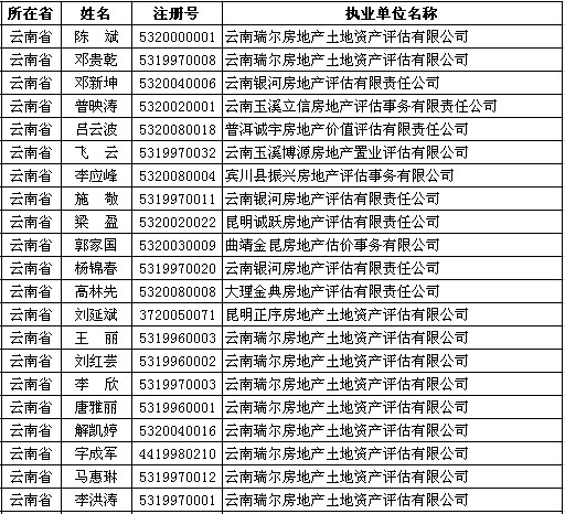 云南房估师4月25日获准延续注册的人员名单