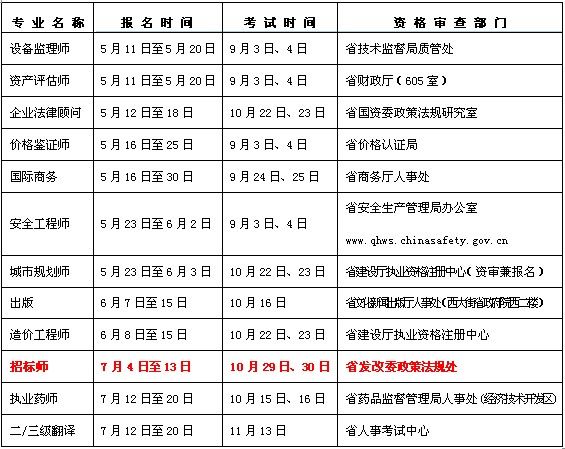 2011年度下半年专业技术人员资格考试报名及考试日期安排表