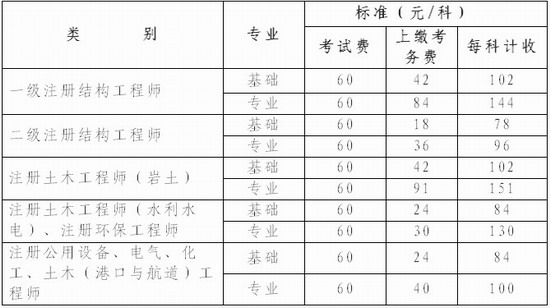 根据计办价格〔2000〕299号、计价格〔2002〕2546号、发改价格〔2007〕55号、发改价格〔2009〕1003号、皖价费〔2006〕240号、皖价费函〔2007〕130号、皖价费函〔2009〕104号、皖价费函〔2009〕198号等文件规定,2011年勘察设计注册工程师执业资格考试的收费标准为: