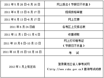 报名时间:2011年5月26日-6月16日(节假日可报名)。报名考生登录黑龙江省人事考试网(http://www.rsks.gov.cn)的“网上报名”栏目,按照考试网上报名系统规定的程序和要求在网上填写个人信息,上传照片,从网上直接打印报名表(报名表用A4纸打印,供现场资格审查时使用)。