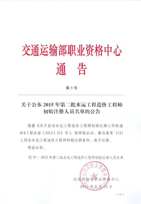 关于公布2015年第二批水运工程造价工程师初始注册人员名单的公告