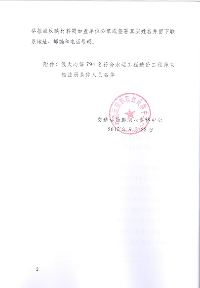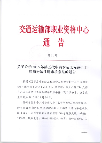 关于公示2015年第五批申请水运工程造价工程师初始注册审核意见的通告