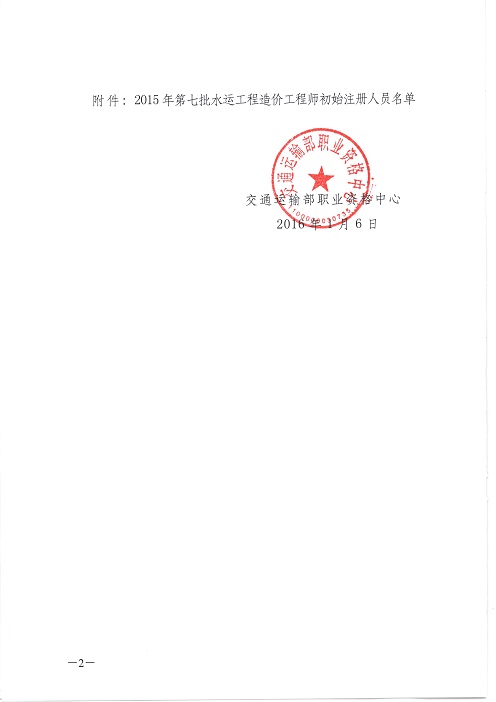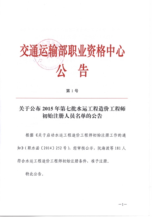 关于公布2015年第七批水运工程造价工程师初始注册人员名单的公告